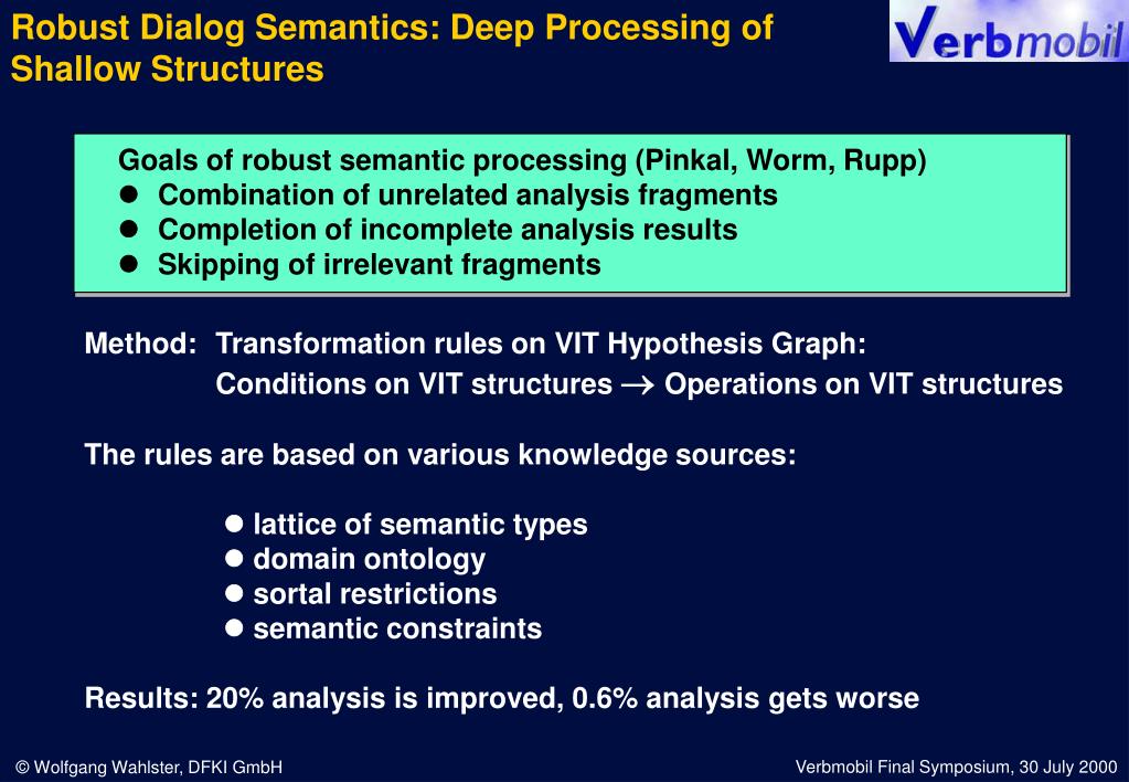 Robust Dialog Semantics: Deep Processing of Shallow Structures Goals of robust semantic processing (Pinkal, Worm, Rupp) l Combination of unrelated analysis fragments l Completion of incomplete analysis results l Skipping of irrelevant fragments Method: Transformation rules on VIT Hypothesis Graph: Conditions on VIT structures Operations on VIT structures The rules are based on various knowledge sources: l lattice of semantic types l domain ontology l sortal restrictions l semantic constraints Results: 20% analysis is improved, 0.6% analysis gets worse