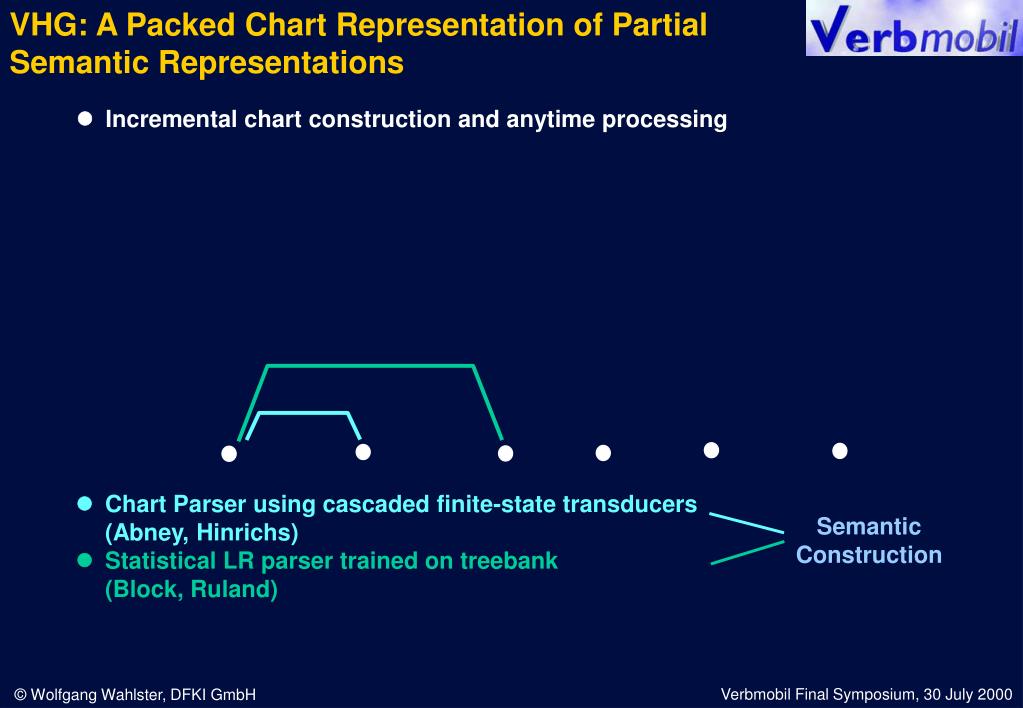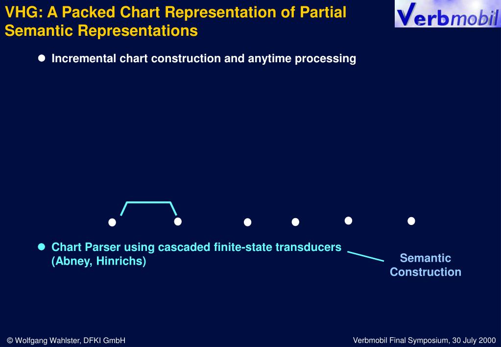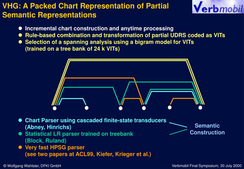 VHG: A Packed Chart Representation of Partial Semantic Representations l Incremental chart construction and anytime processing l Chart Parser using cascaded finite-state transducers (Abney, Hinrichs) l Statistical LR parser trained on treebank (Block, Ruland) l Very fast HPSG parser (see two papers at ACL99, Kiefer, Krieger et al.) Semantic Construction