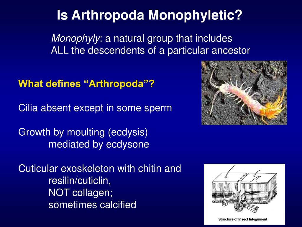 Is Arthropoda Monophyletic? Monophyly: a natural group that includes ALL the descendents of a particular ancestor What defines “Arthropoda”? Cilia absent except in some sperm Growth by moulting (ecdysis) mediated by ecdysone Cuticular exoskeleton with chitin and resilin/cuticlin, NOT collagen; sometimes calcified