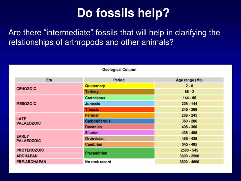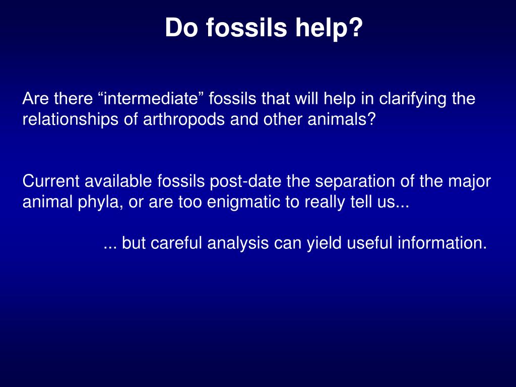Do fossils help? Are there “intermediate” fossils that will help in clarifying the relationships of arthropods and other animals? Current available fossils post-date the separation of the major animal phyla, or are too enigmatic to really tell us... ... but careful analysis can yield useful information.