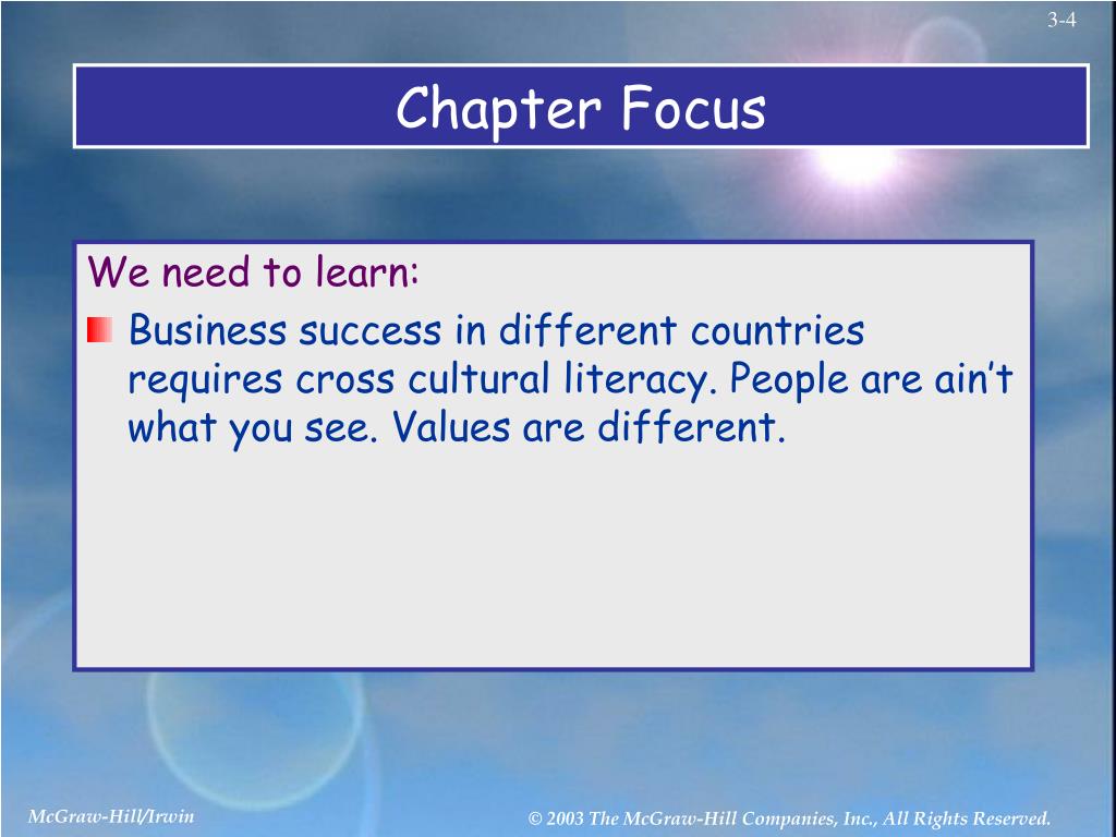 Chapter Focus We need to learn: • Business success in different countries requires cross cultural literacy. People are ain’t what you see. Values are different.