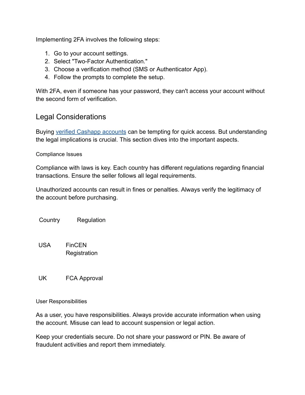 Implementing 2FA involves the following steps: 1. Go to your account settings. 2. Select "Two-Factor Authentication." 3. Choose a verification method (SMS or Authenticator App). 4. Follow the prompts to complete the setup. With 2FA, even if someone has your password, they can't access your account without the second form of verification. Legal Considerations Buying verified Cashapp accounts can be tempting for quick access. But understanding the legal implications is crucial. This section dives into the important aspects. Compliance Issues Compliance with laws is key. Each country has different regulations regarding financial transactions. Ensure the seller follows all legal requirements. Unauthorized accounts can result in fines or penalties. Always verify the legitimacy of the account before purchasing. Country Regulation USA FinCEN Registration UK FCA Approval User Responsibilities As a user, you have responsibilities. Always provide accurate information when using the account. Misuse can lead to account suspension or legal action. Keep your credentials secure. Do not share your password or PIN. Be aware of fraudulent activities and report them immediately.