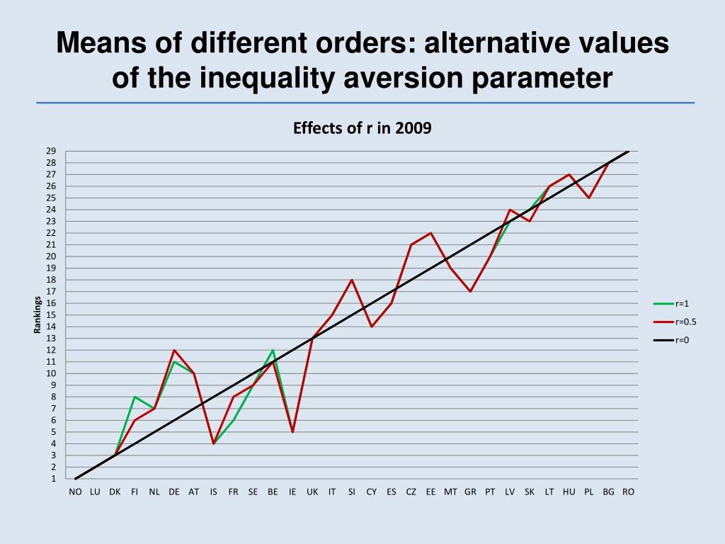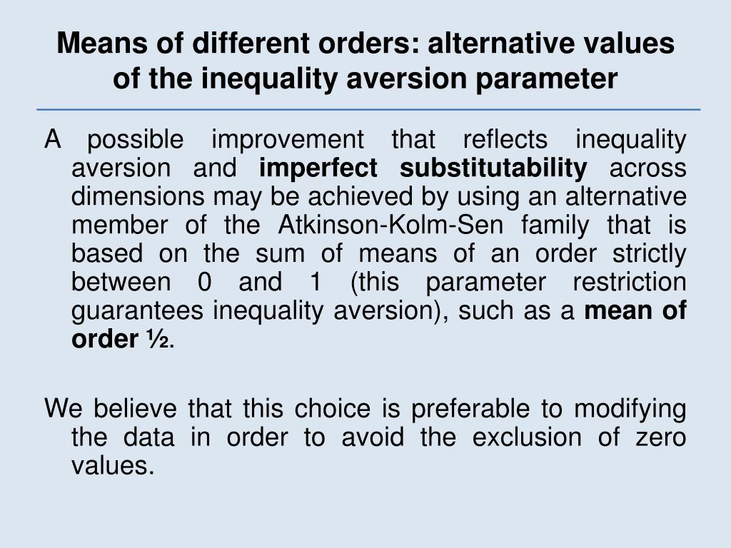 Means of different orders: alternative values of the inequality aversion parameter A possible improvement that reflects inequality aversion and imperfect substitutability across dimensions may be achieved by using an alternative member of the Atkinson-Kolm-Sen family that is based on the sum of means of an order strictly between 0 and 1 (this parameter restriction guarantees inequality aversion), such as a mean of order ½. We believe that this choice is preferable to modifying the data in order to avoid the exclusion of zero values.