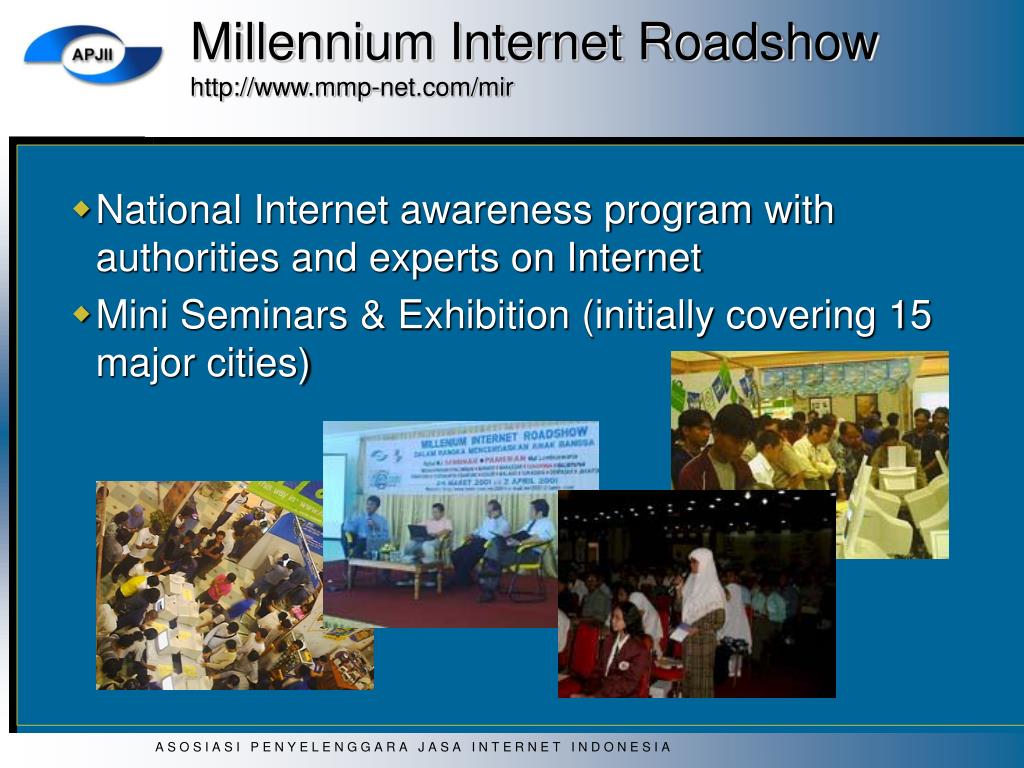 Millennium Internet Roadshowhttp://www.mmp-net.com/mir • National Internet awareness program with authorities and experts on Internet • Mini Seminars & Exhibition (initially covering 15 major cities)