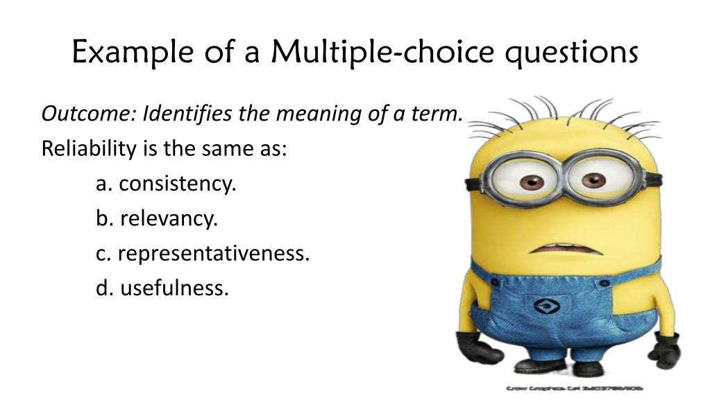 Example of a Multiple-choice questions Outcome: Identifies the meaning of a term. Reliability is the same as: a. consistency. b. relevancy. c. representativeness. d. usefulness.