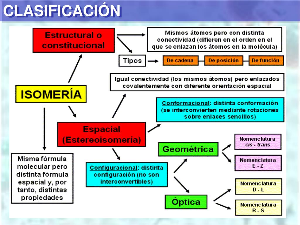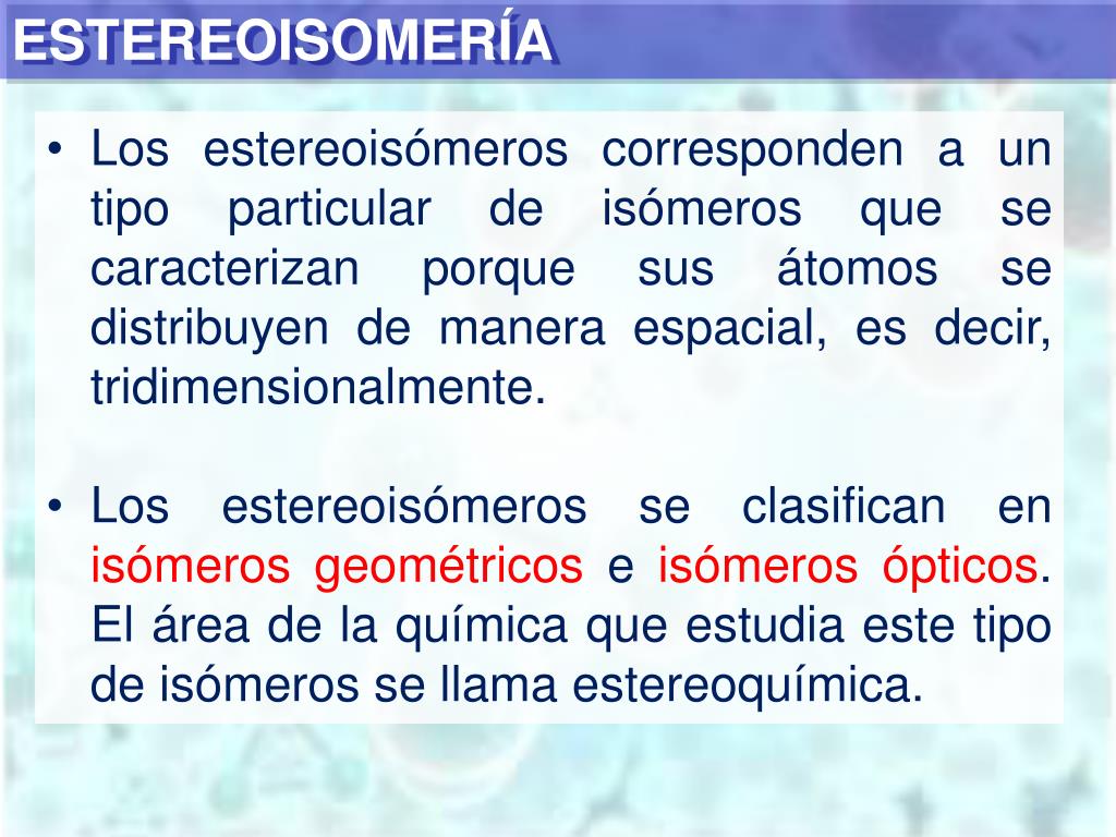 ESTEREOISOMERÍA • Los estereoisómeros corresponden a un tipo particular de isómeros que se caracterizan porque sus átomos se distribuyen de manera espacial, es decir, tridimensionalmente. • Los estereoisómeros se clasifican en isómeros geométricos e isómeros ópticos. El área de la química que estudia este tipo de isómeros se llama estereoquímica.