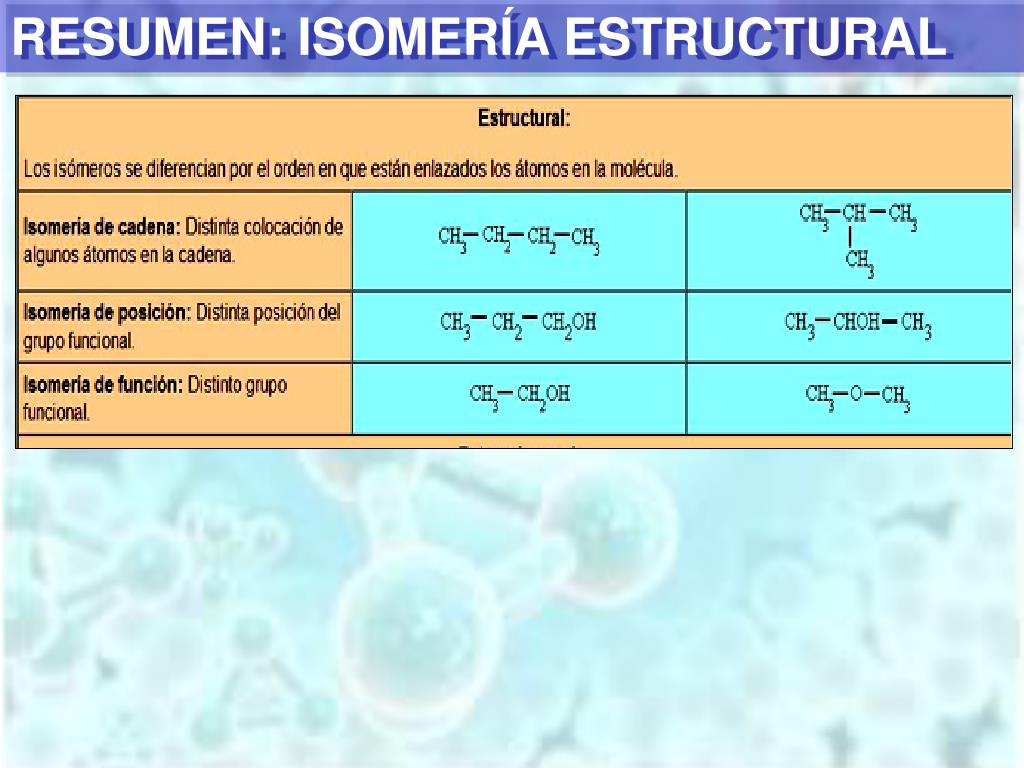 RESPUESTA • ¿Cuáles de las siguientes parejas son isómeros y de qué tipo? CH3-CH=CH2 y CH3-C≡CH • No son isómeros, la fórmula molecular (fórmula química) es diferente.