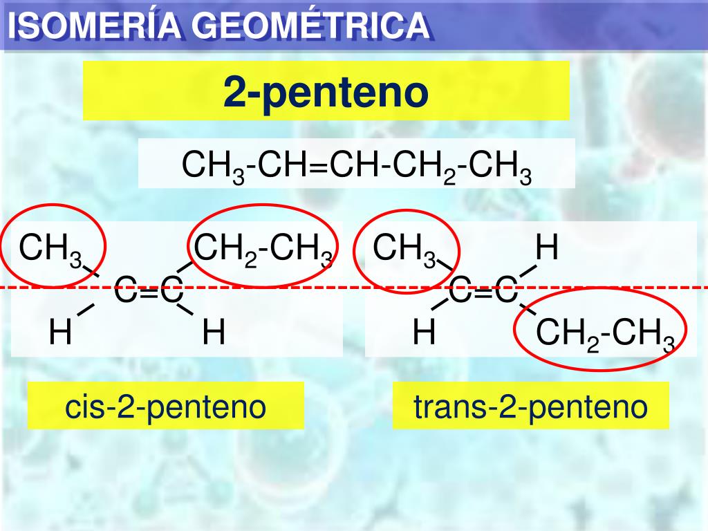 ISOMERÍA GEOMÉTRICA 2-penteno CH3-CH=CH-CH2-CH3 CH3 CH2-CH3 C=C H H CH3 H C=C H CH2-CH3 cis-2-penteno trans-2-penteno
