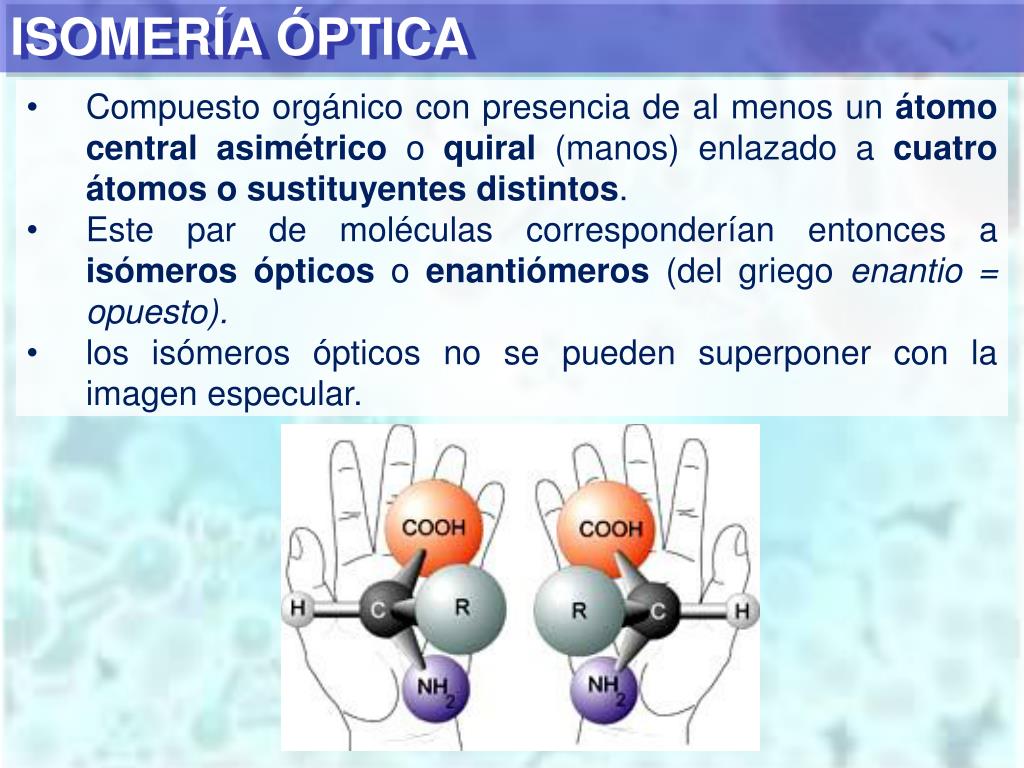 ISOMERÍA ÓPTICA • Compuesto orgánico con presencia de al menos un átomo central asimétrico o quiral (manos) enlazado a cuatro átomos o sustituyentes distintos. • Este par de moléculas corresponderían entonces a isómeros ópticos o enantiómeros (del griego enantio = opuesto). • los isómeros ópticos no se pueden superponer con la imagen especular.