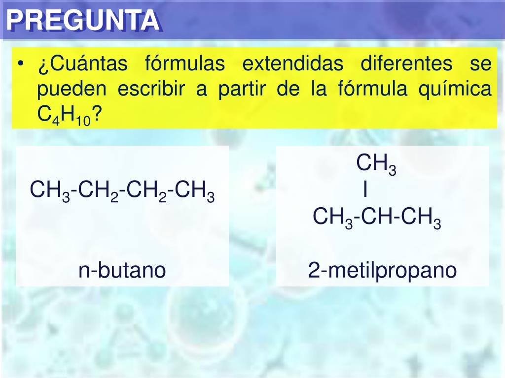PREGUNTA • ¿Cuántas fórmulas extendidas diferentes se pueden escribir a partir de la fórmula química C4H10? CH3 I CH3-CH-CH3 2-metilpropano CH3-CH2-CH2-CH3 n-butano