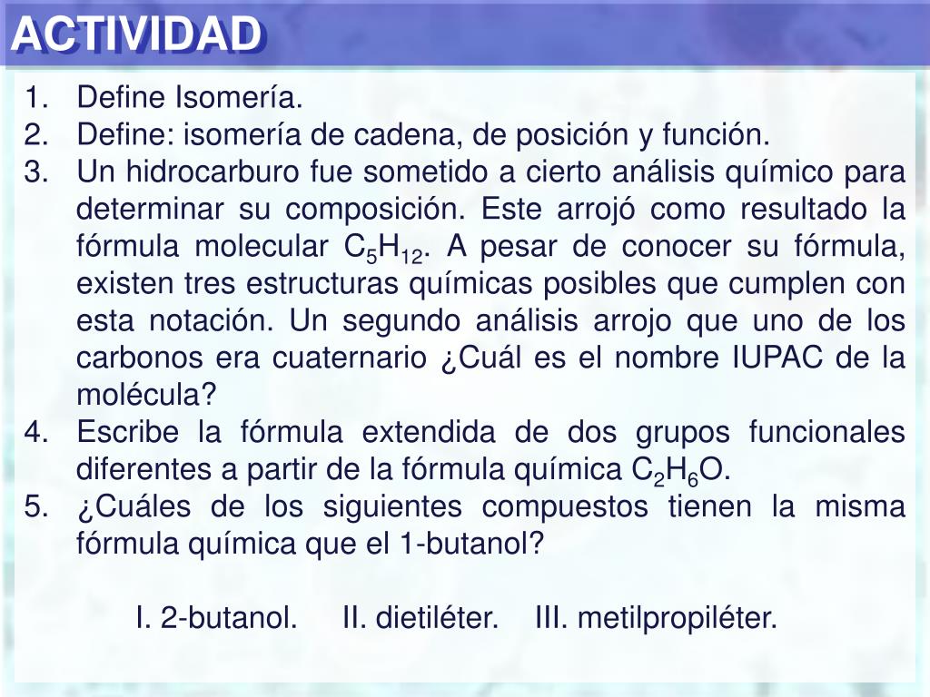 ACTIVIDAD Define Isomería. Define: isomería de cadena, de posición y función. Un hidrocarburo fue sometido a cierto análisis químico para determinar su composición. Este arrojó como resultado la fórmula molecular C5H12. A pesar de conocer su fórmula, existen tres estructuras químicas posibles que cumplen con esta notación. Un segundo análisis arrojo que uno de los carbonos era cuaternario ¿Cuál es el nombre IUPAC de la molécula? Escribe la fórmula extendida de dos grupos funcionales diferentes a partir de la fórmula química C2H6O. ¿Cuáles de los siguientes compuestos tienen la misma fórmula química que el 1-butanol? I. 2-butanol. II. dietiléter. III. metilpropiléter.