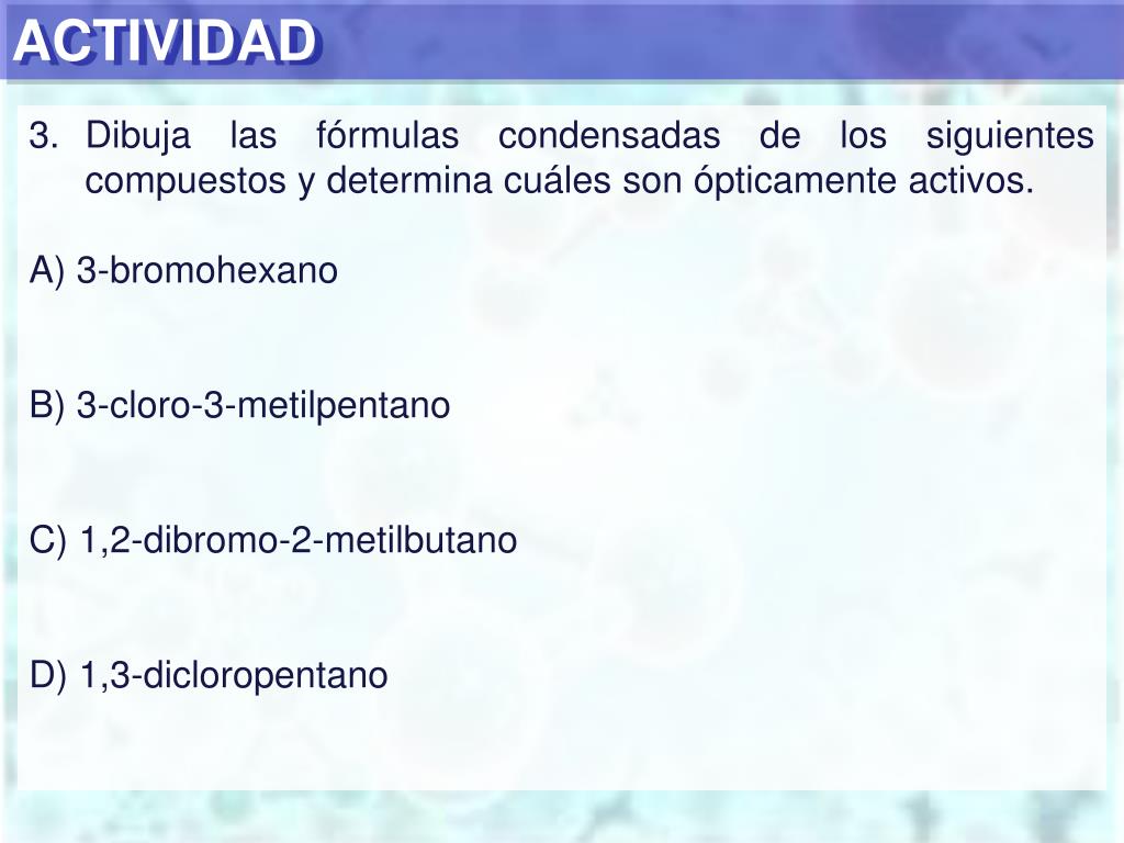 ACTIVIDAD • Dibuja las fórmulas condensadas de los siguientes compuestos y determina cuáles son ópticamente activos. • A) 3-bromohexano • B) 3-cloro-3-metilpentano • C) 1,2-dibromo-2-metilbutano • D) 1,3-dicloropentano