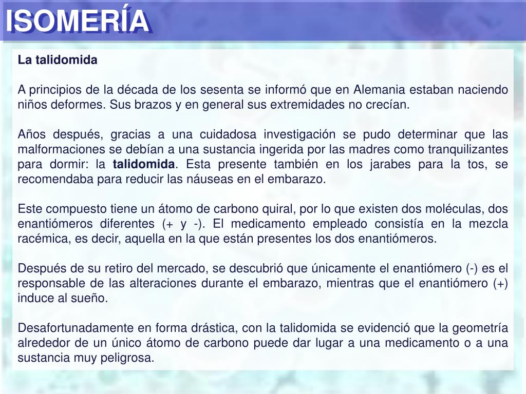 ISOMERÍA La talidomida A principios de la década de los sesenta se informó que en Alemania estaban naciendo niños deformes. Sus brazos y en general sus extremidades no crecían. Años después, gracias a una cuidadosa investigación se pudo determinar que las malformaciones se debían a una sustancia ingerida por las madres como tranquilizantes para dormir: la talidomida. Esta presente también en los jarabes para la tos, se recomendaba para reducir las náuseas en el embarazo. Este compuesto tiene un átomo de carbono quiral, por lo que existen dos moléculas, dos enantiómeros diferentes (+ y -). El medicamento empleado consistía en la mezcla racémica, es decir, aquella en la que están presentes los dos enantiómeros. Después de su retiro del mercado, se descubrió que únicamente el enantiómero (-) es el responsable de las alteraciones durante el embarazo, mientras que el enantiómero (+) induce al sueño. Desafortunadamente en forma drástica, con la talidomida se evidenció que la geometría alrededor de un único átomo de carbono puede dar lugar a una medicamento o a una sustancia muy peligrosa.