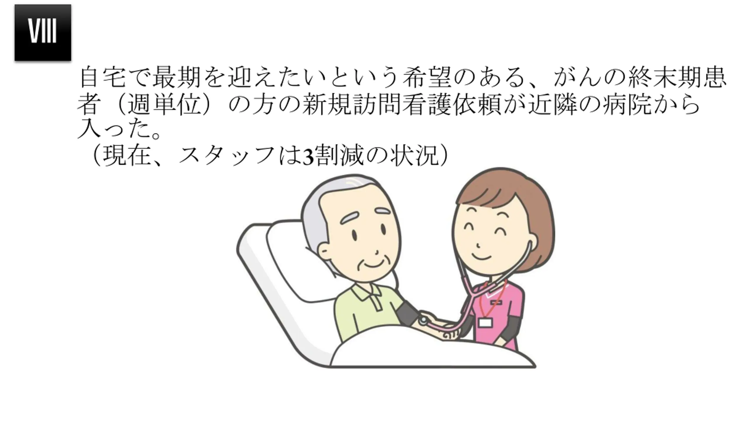 Ⅷ 自宅で最期を迎えたいという希望のある、がんの終末期患 者(週単位)の方の新規訪問看護依頼が近隣の病院から 入った。 (現在、スタッフは 割減の状況)