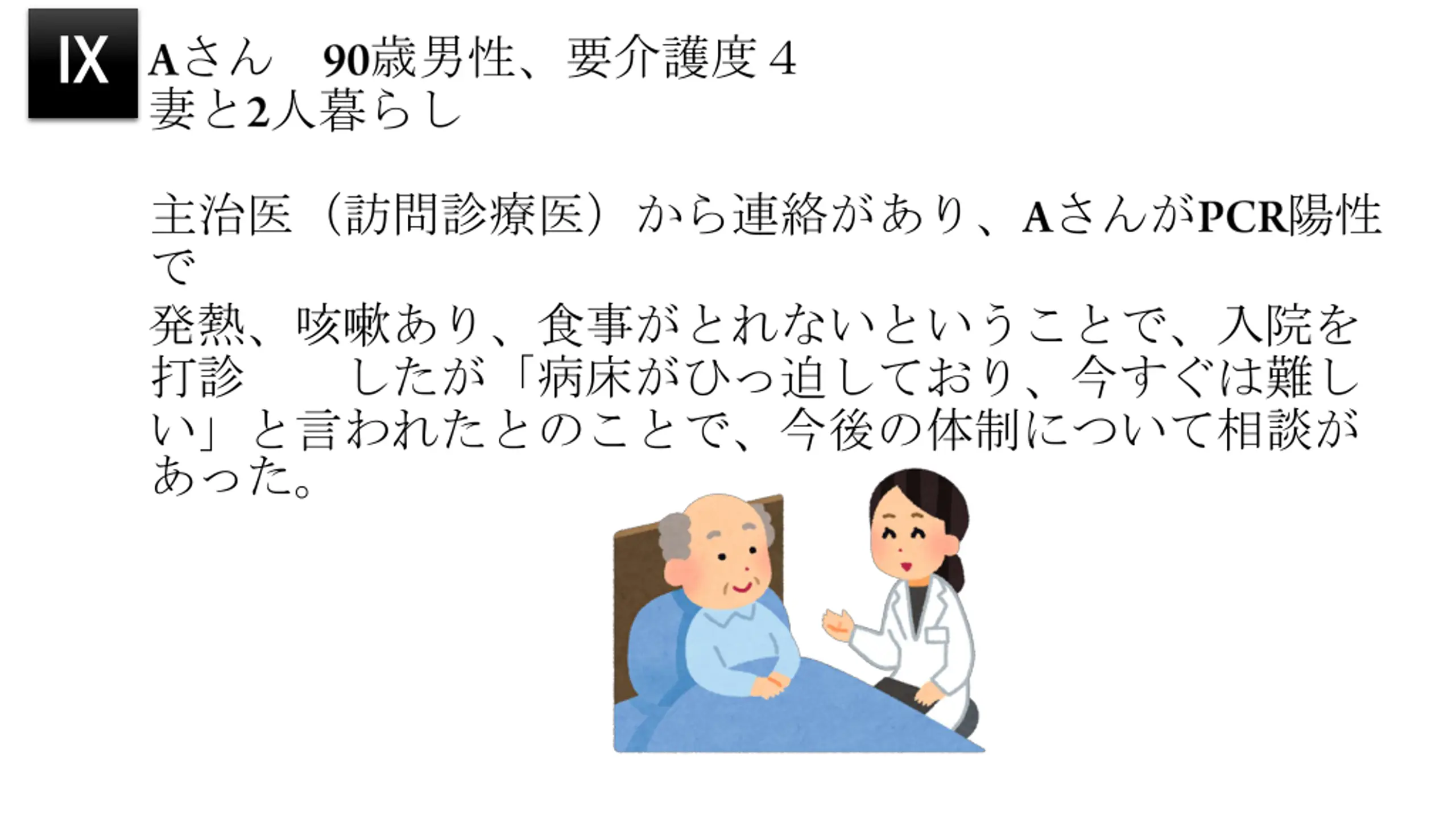 Ⅸ さん 妻と 人暮らし 歳男性、要介護度4 主治医(訪問診療医)から連絡があり、 さんが で 発熱、咳嗽あり、食事がとれないということで、入院を 打診 したが「病床がひっ迫しており、今すぐは難し い」と言われたとのことで、今後の体制について相談が あった。 陽性