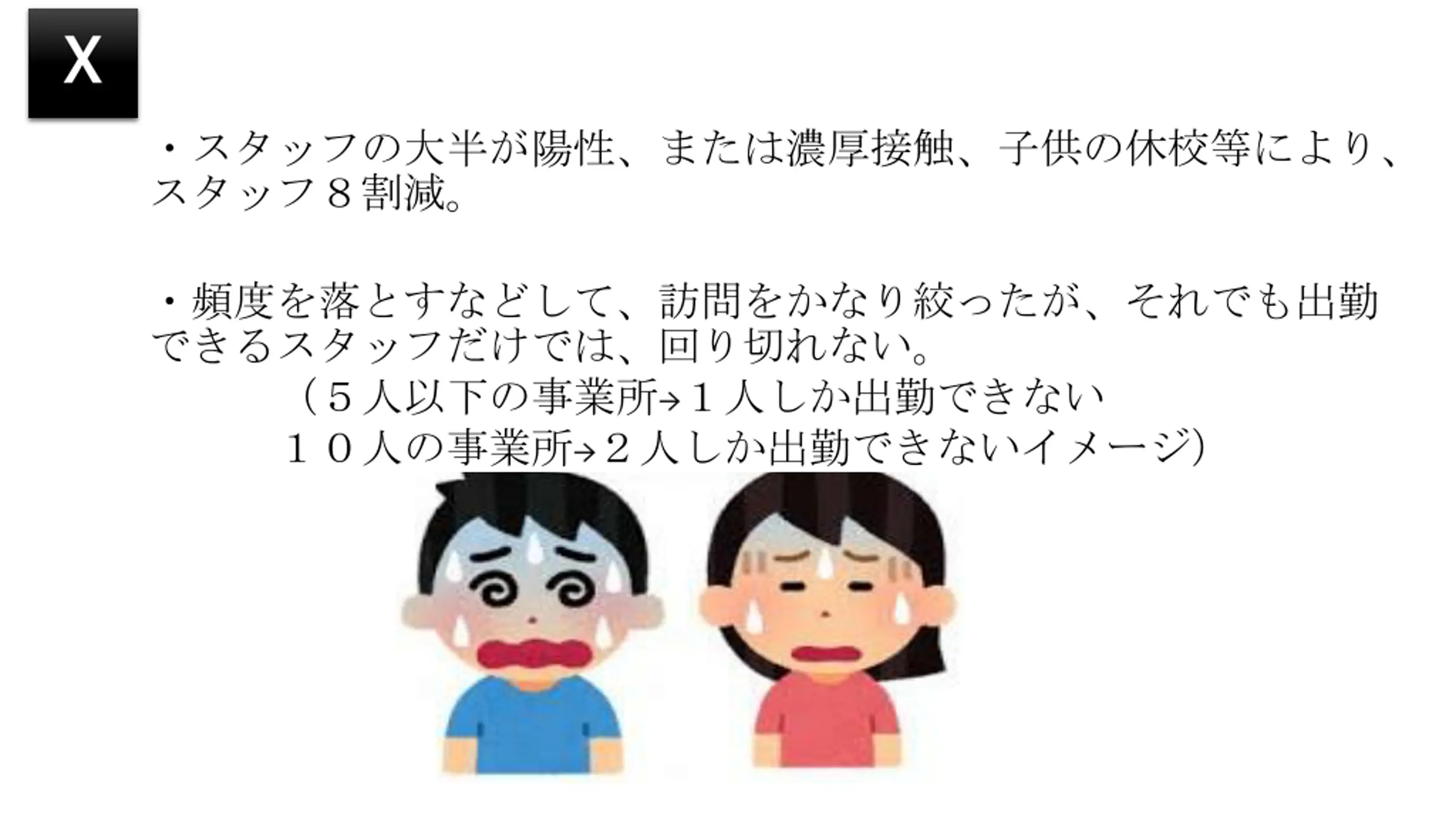 Ⅹ ・スタッフの大半が陽性、または濃厚接触、子供の休校等により、 スタッフ8割減。 ・頻度を落とすなどして、訪問をかなり絞ったが、それでも出勤 できるスタッフだけでは、回り切れない。 (5人以下の事業所 1人しか出勤できない 10人の事業所 2人しか出勤できないイメージ)