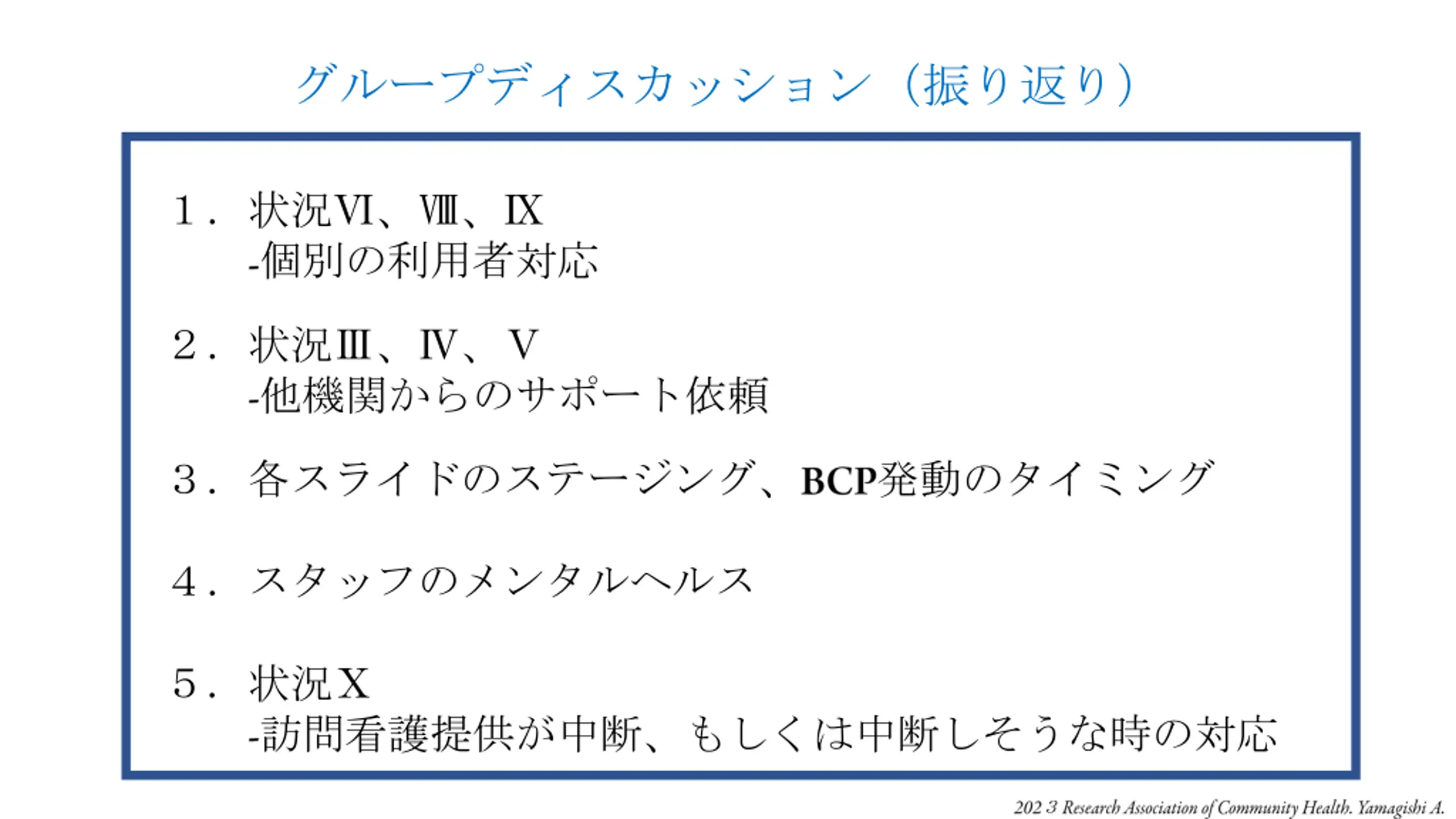 グループディスカッション(振り返り) 1.状況Ⅵ、Ⅷ、Ⅸ 個別の利用者対応 2.状況Ⅲ、Ⅳ、Ⅴ 他機関からのサポート依頼 3.各スライドのステージング、 発動のタイミング 4.スタッフのメンタルヘルス 5.状況Ⅹ 訪問看護提供が中断、もしくは中断しそうな時の対応 3