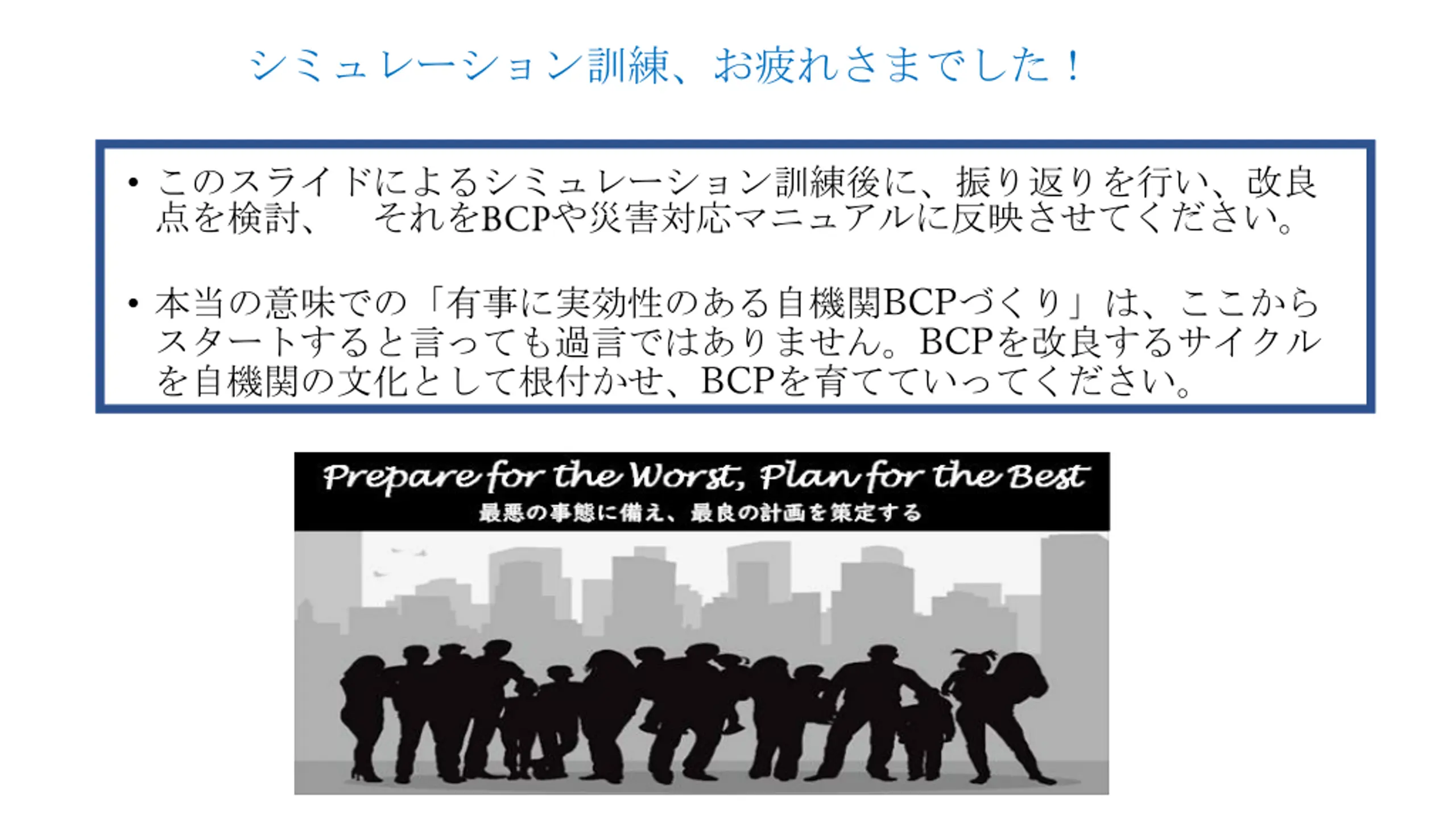 シミュレーション訓練、お疲れさまでした! • このスライドによるシミュレーション訓練後に、振り返りを行い、改良 点を検討、 それを や災害対応マニュアルに反映させてください。 • 本当の意味での「有事に実効性のある自機関BCPづくり」は、ここから スタートすると言っても過言ではありません。BCPを改良するサイクル を自機関の文化として根付かせ、BCPを育てていってください。