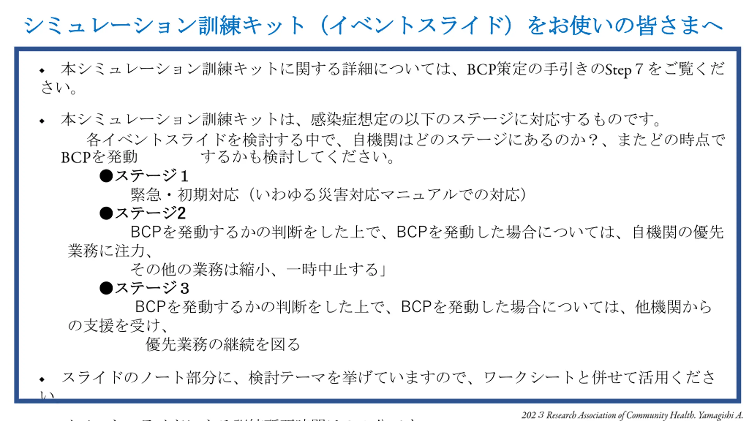 シミュレーション訓練キット(イベントスライド)をお使いの皆さまへシミュレーション訓練キット(イベントスライド)をお使いの皆さまへ シミュレーション訓練キット(イベントスライド)をお使いの皆さまへ 本シミュレーション訓練キットに関する詳細については、 さい。 策定の手引きの 7をご覧くだ 本シミュレーション訓練キットは、感染症想定の以下のステージに対応するものです。 各イベントスライドを検討する中で、自機関はどのステージにあるのか?、またどの時点で を発動 するかも検討してください。 ●ステージ1 ステージ1 緊急・初期対応(いわゆる災害対応マニュアルでの対応) ●ステージ ステージ2 BCPを発動するかの判断をした上で、BCPを発動した場合については、自機関の優先 業務に注力、 その他の業務は縮小、一時中止する」 ●ステージ ステージ3 3 BCPを発動するかの判断をした上で、BCPを発動した場合については、他機関から の支援を受け、 優先業務の継続を図る スライドのノート部分に、検討テーマを挙げていますので、ワークシートと併せて活用くださ い。 3 イベントスライドによる訓練所要時間は30分です。
