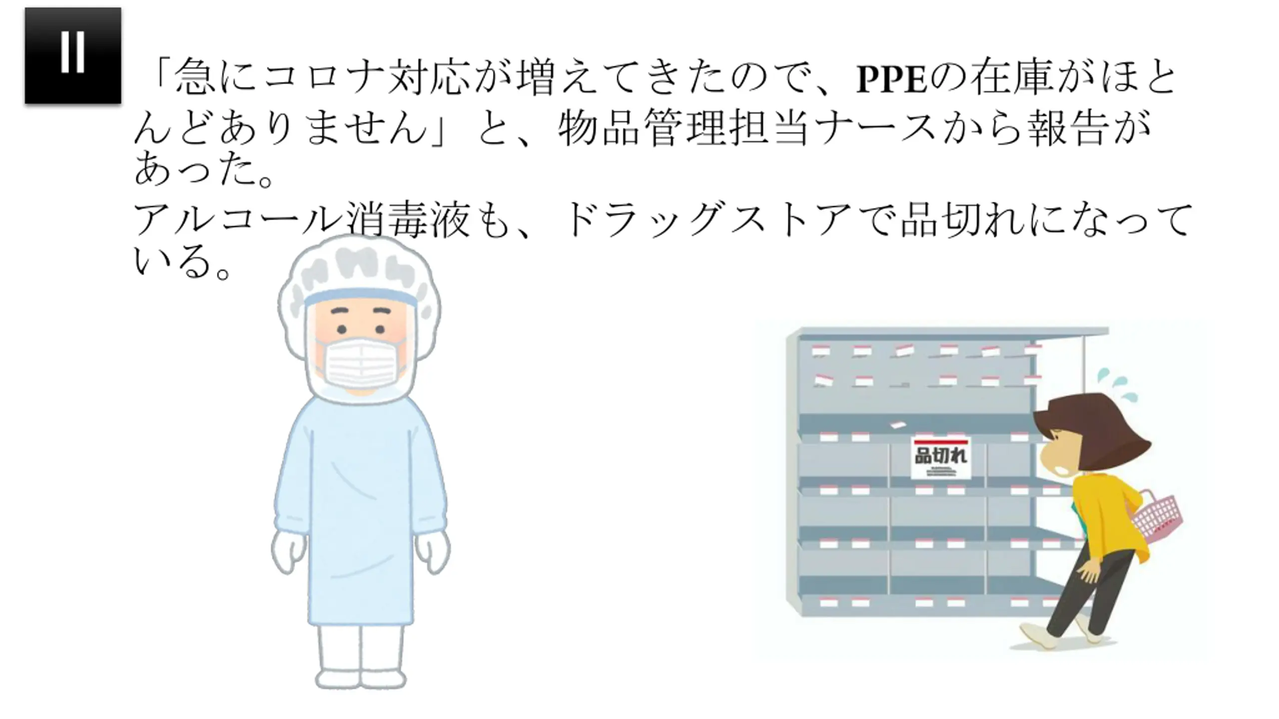Ⅱ 「急にコロナ対応が増えてきたので、 んどありません」と、物品管理担当ナースから報告が あった。 アルコール消毒液も、ドラッグストアで品切れになって いる。 の在庫がほと