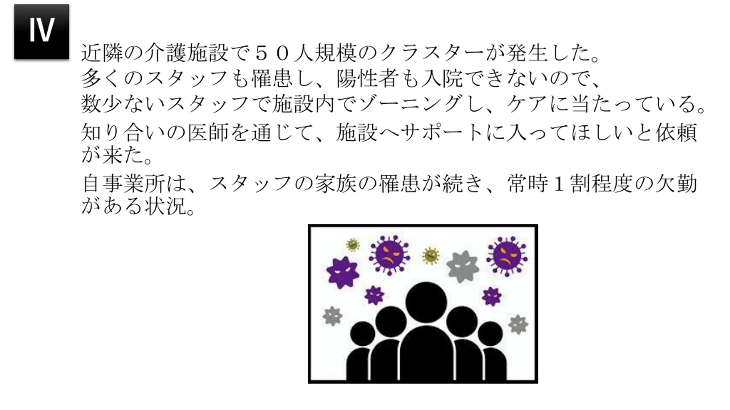 Ⅳ 近隣の介護施設で50人規模のクラスターが発生した。 多くのスタッフも罹患し、陽性者も入院できないので、 数少ないスタッフで施設内でゾーニングし、ケアに当たっている。 知り合いの医師を通じて、施設へサポートに入ってほしいと依頼 が来た。 自事業所は、スタッフの家族の罹患が続き、常時1割程度の欠勤 がある状況。