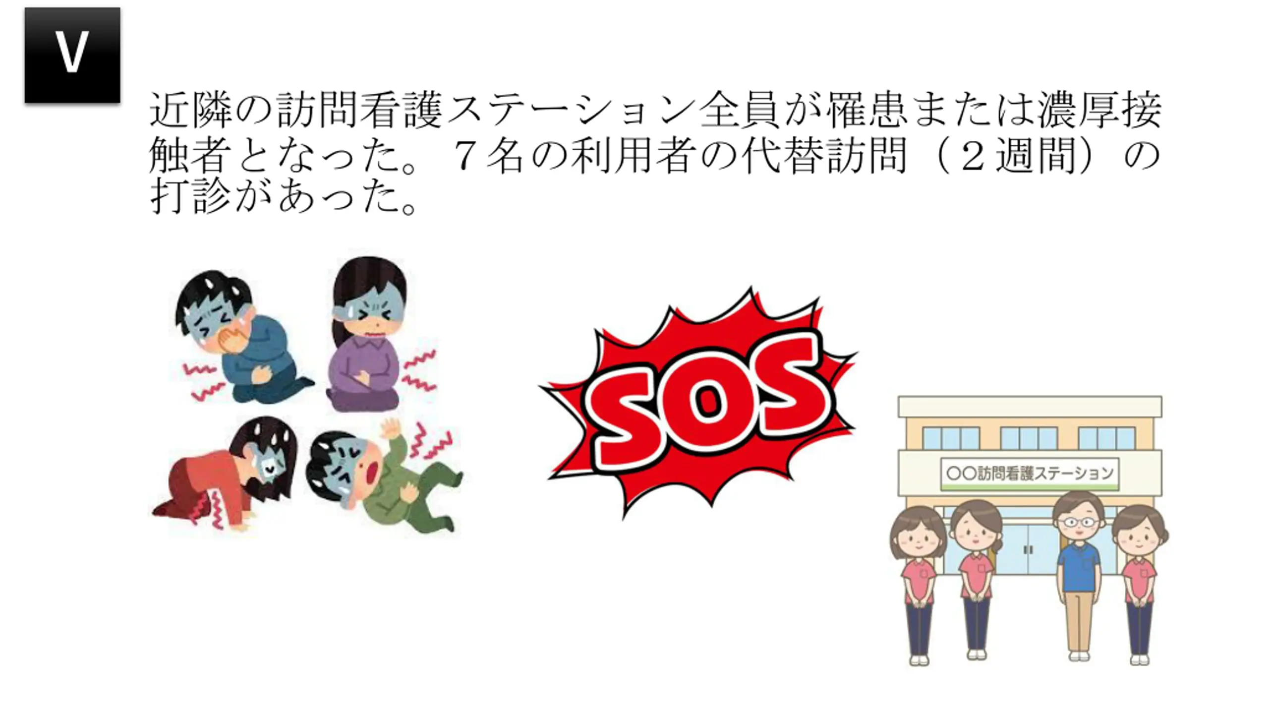 Ⅴ 近隣の訪問看護ステーション全員が罹患または濃厚接 触者となった。7名の利用者の代替訪問(2週間)の 打診があった。