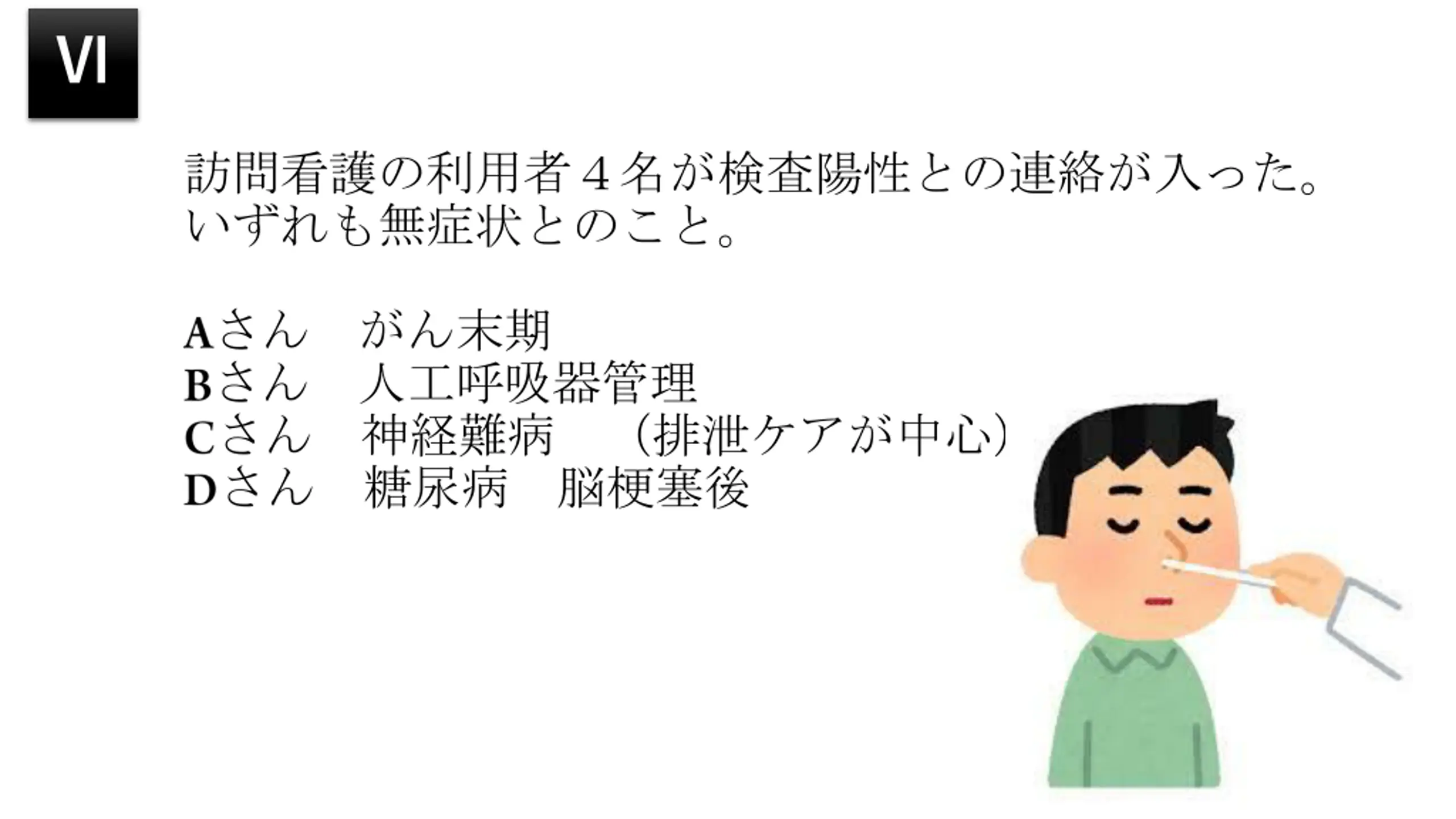 Ⅵ 訪問看護の利用者4名が検査陽性との連絡が入った。 いずれも無症状とのこと。 さん さん さん さん がん末期 人工呼吸器管理 神経難病 糖尿病 (排泄ケアが中心) 脳梗塞後