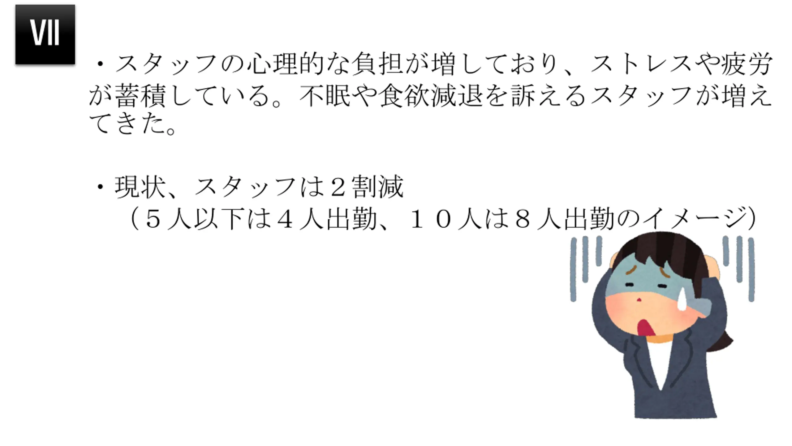 Ⅶ ・スタッフの心理的な負担が増しており、ストレスや疲労 が蓄積している。不眠や食欲減退を訴えるスタッフが増え てきた。 ・現状、スタッフは2割減 (5人以下は4人出勤、10人は8人出勤のイメージ)