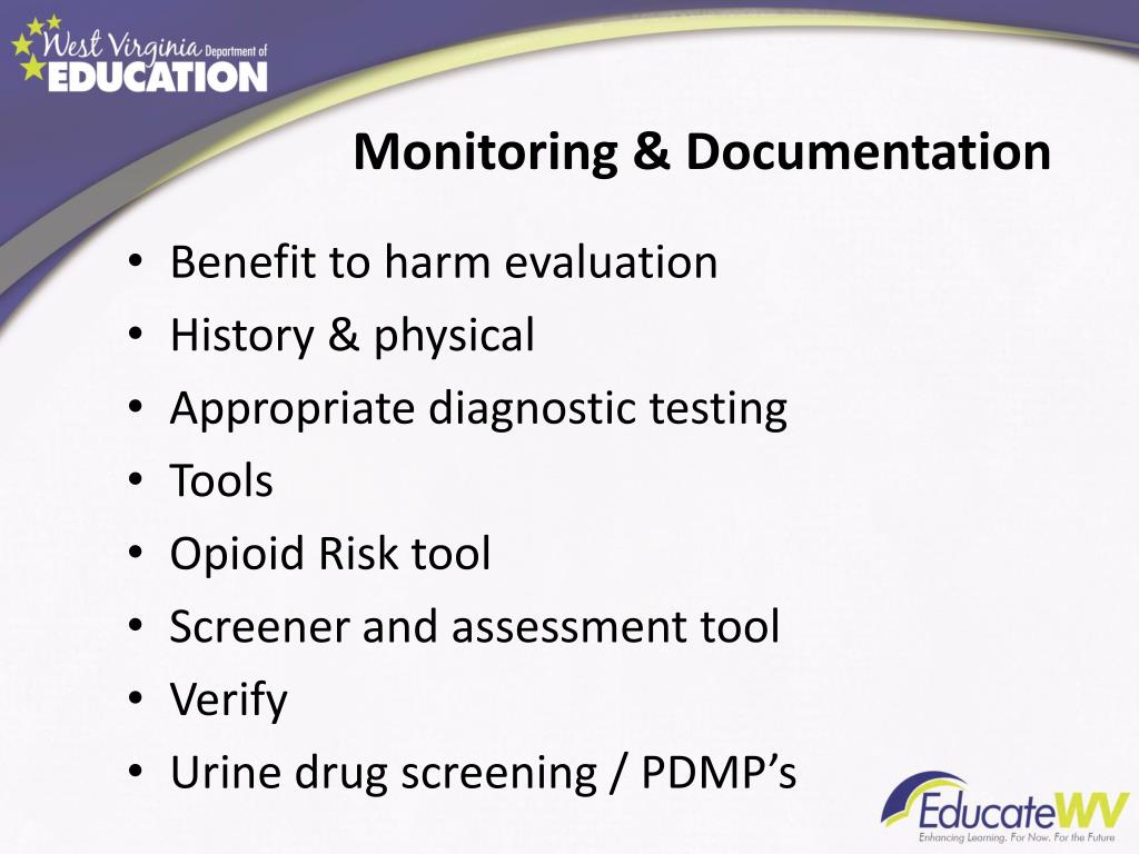 Monitoring & Documentation • Benefit to harm evaluation • History & physical • Appropriate diagnostic testing • Tools • Opioid Risk tool • Screener and assessment tool • Verify • Urine drug screening / PDMP’s