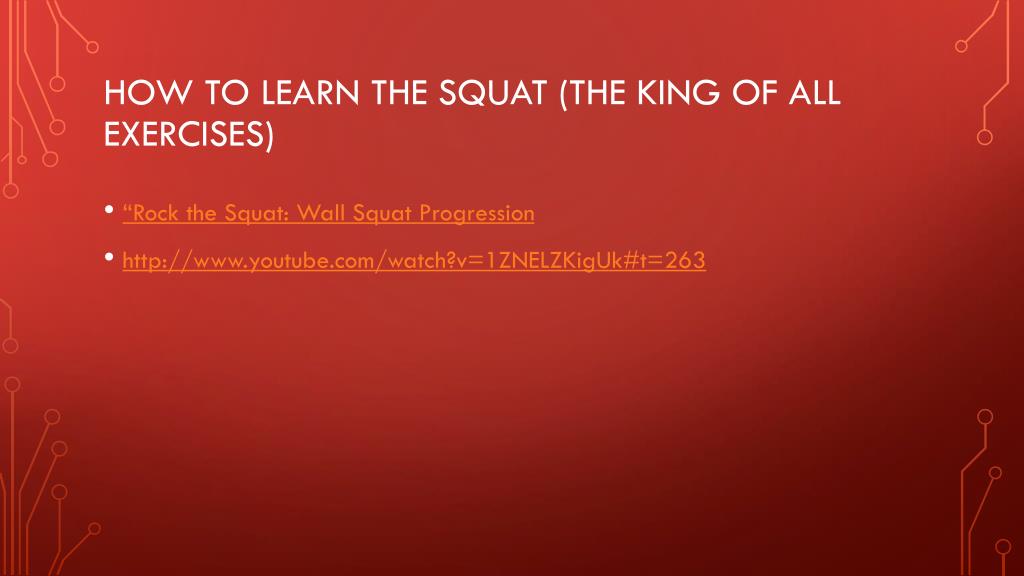 How to learn the squat (The king of all exercises) • “Rock the Squat: Wall Squat Progression • http://www.youtube.com/watch?v=1ZNELZKigUk#t=263
