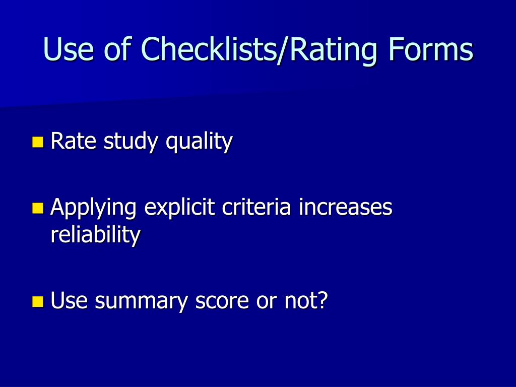 Use of Checklists/Rating Forms • Rate study quality • Applying explicit criteria increases reliability • Use summary score or not?