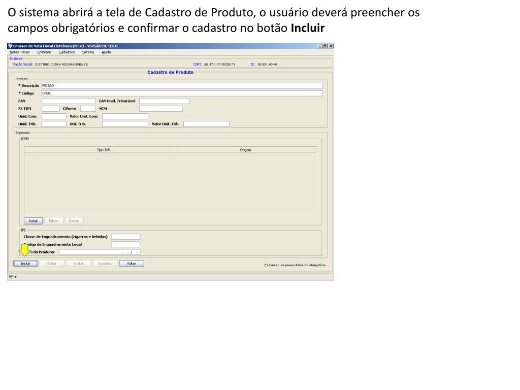 Inclusão de novo produto Opção de Inclusão de novo produto para o Emitente atual.Pré-condição: Um emitente deverá estar previamente iniciado.Acessar o menu: Cadastro -> ProdutoNa tela de pesquisa de Produtos Cadastrados, acessar a opção IncluirNa tela de Inclusão de Produtos, preencher corretamente os campos do produtoApós o preenchimento dos campos corretamente, selecionar a opção Incluir da aba Impostos Inclusão dos dados do produto: