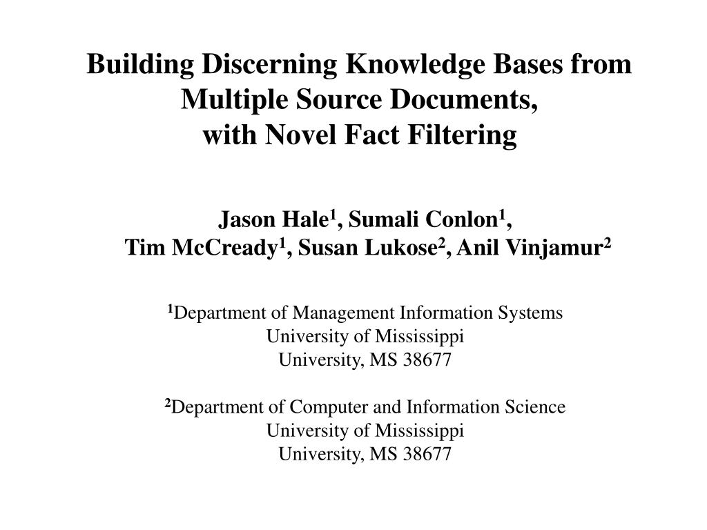 Building Discerning Knowledge Bases from Multiple Source Documents, with Novel Fact Filtering. Jason Hale 1 , Sumali Conlon 1 , Tim McCready 1 , Susan Lukose 2 , Anil Vinjamur 2 1 Department of Management Information Systems University of Mississippi University, MS 38677