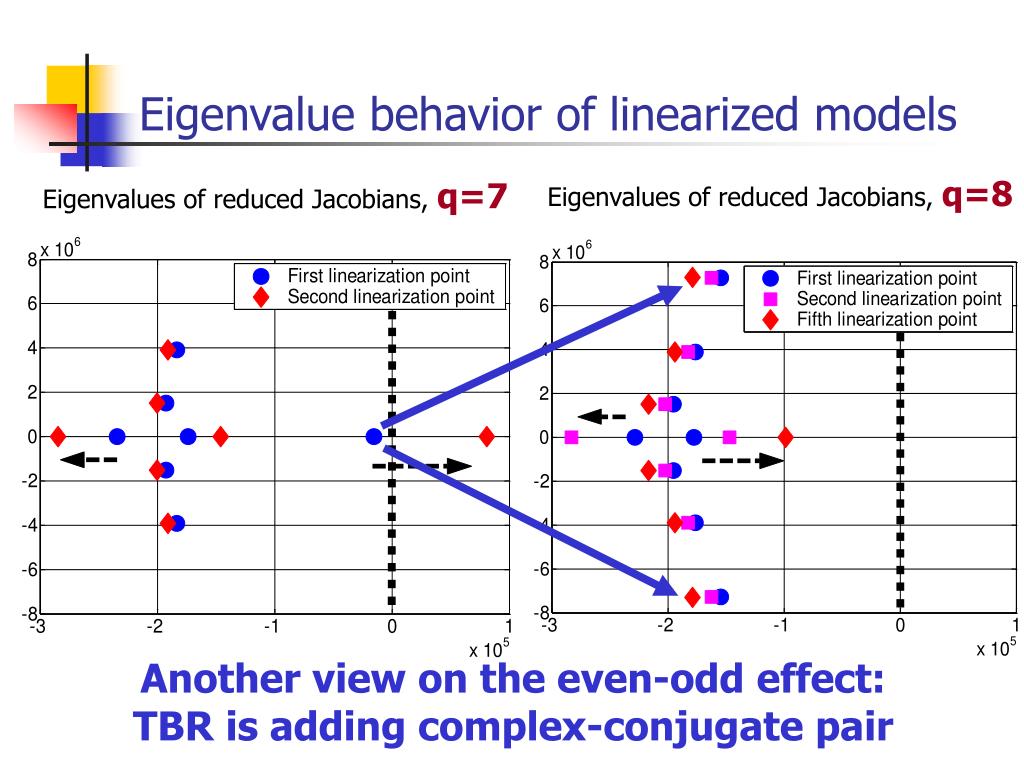 Eigenvalue behavior of linearized models Eigenvalues of reduced Jacobians, q=8 Eigenvalues of reduced Jacobians, q=7 Another view on the even-odd effect: TBR is adding complex-conjugate pair