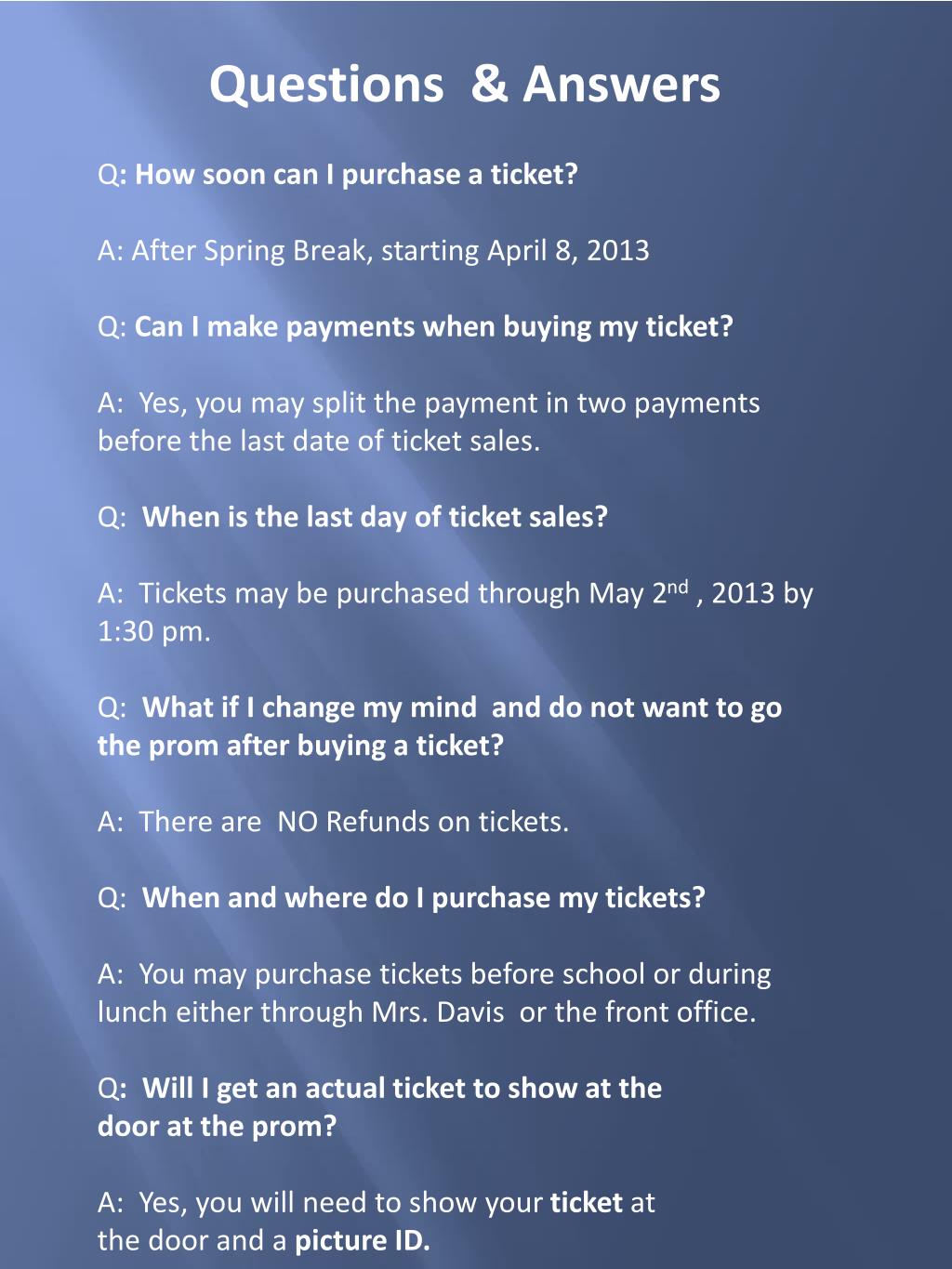 Questions & Answers Q: How soon can I purchase a ticket? A: After Spring Break, starting April 8, 2013 Q: Can I make payments when buying my ticket? A: Yes, you may split the payment in two payments before the last date of ticket sales. Q: When is the last day of ticket sales? A: Tickets may be purchased through May 2nd , 2013 by 1:30 pm. Q: What if I change my mind and do not want to go the prom after buying a ticket? A: There are NO Refunds on tickets. Q: When and where do I purchase my tickets? A: You may purchase tickets before school or during lunch either through Mrs. Davis or the front office. Q: Will I get an actual ticket to show at the door at the prom? A: Yes, you will need to show your ticket at the door and a picture ID.