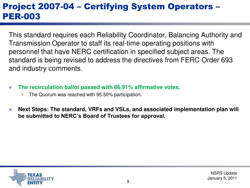 Project 2007-04 – Certifying System Operators – PER-003 This standard requires each Reliability Coordinator, Balancing Authority and Transmission Operator to staff its real-time operating positions with personnel that have NERC certification in specified subject areas.The standard is being revised to address the directives from FERC Order 693 and industry comments. • The recirculation ballot passed with 86.91% affirmative votes. • The Quorum was reached with 95.50% participation. • Next Steps: The standard, VRFs and VSLs, and associated implementation plan will be submitted to NERC’s Board of Trustees for approval. NSRS Update January 5, 2011