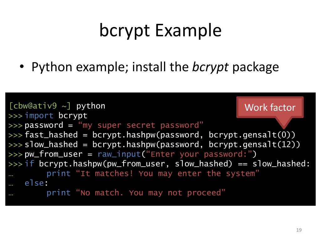 bcrypt Example • Python example; install the bcrypt package [cbw@ativ9 ~] python >>>importbcrypt >>> password = “my super secret password” >>>fast_hashed = bcrypt.hashpw(password, bcrypt.gensalt(0)) >>>slow_hashed = bcrypt.hashpw(password, bcrypt.gensalt(12)) >>>pw_from_user = raw_input(“Enter your password:”) >>>ifbcrypt.hashpw(pw_from_user, slow_hashed) == slow_hashed: …print“It matches! You may enter the system” …else: …print“No match. You may not proceed” Work factor