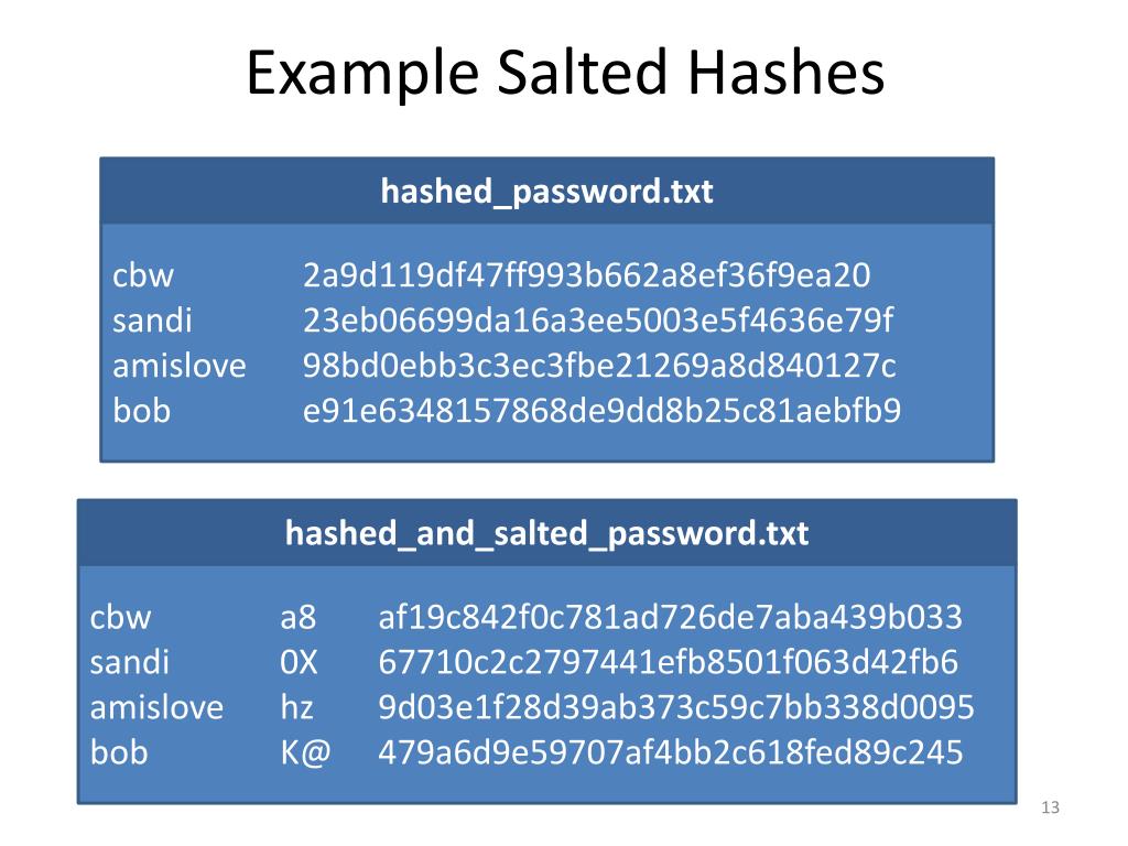 Hashed Password Example md5(‘p4ssw0rd’) = 2a9d119df47ff993b662a8ef36f9ea20 User: cbw md5(‘2a9d119df47ff993b662a8ef36f9ea20’) = b35596ed3f0d5134739292faa04f7ca3 hashed_password.txt cbw2a9d119df47ff993b662a8ef36f9ea20 sandi 23eb06699da16a3ee5003e5f4636e79f amislove98bd0ebb3c3ec3fbe21269a8d840127c bobe91e6348157868de9dd8b25c81aebfb9
