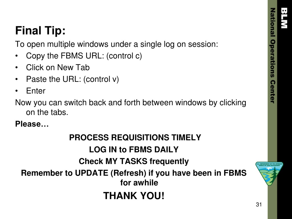 Final Tip: To open multiple windows under a single log on session: • Copy the FBMS URL: (control c) • Click on New Tab • Paste the URL: (control v) • Enter Now you can switch back and forth between windows by clicking on the tabs. Please… PROCESS REQUISITIONS TIMELY LOG IN to FBMS DAILY Check MY TASKS frequently Remember to UPDATE (Refresh) if you have been in FBMS for awhile THANK YOU!