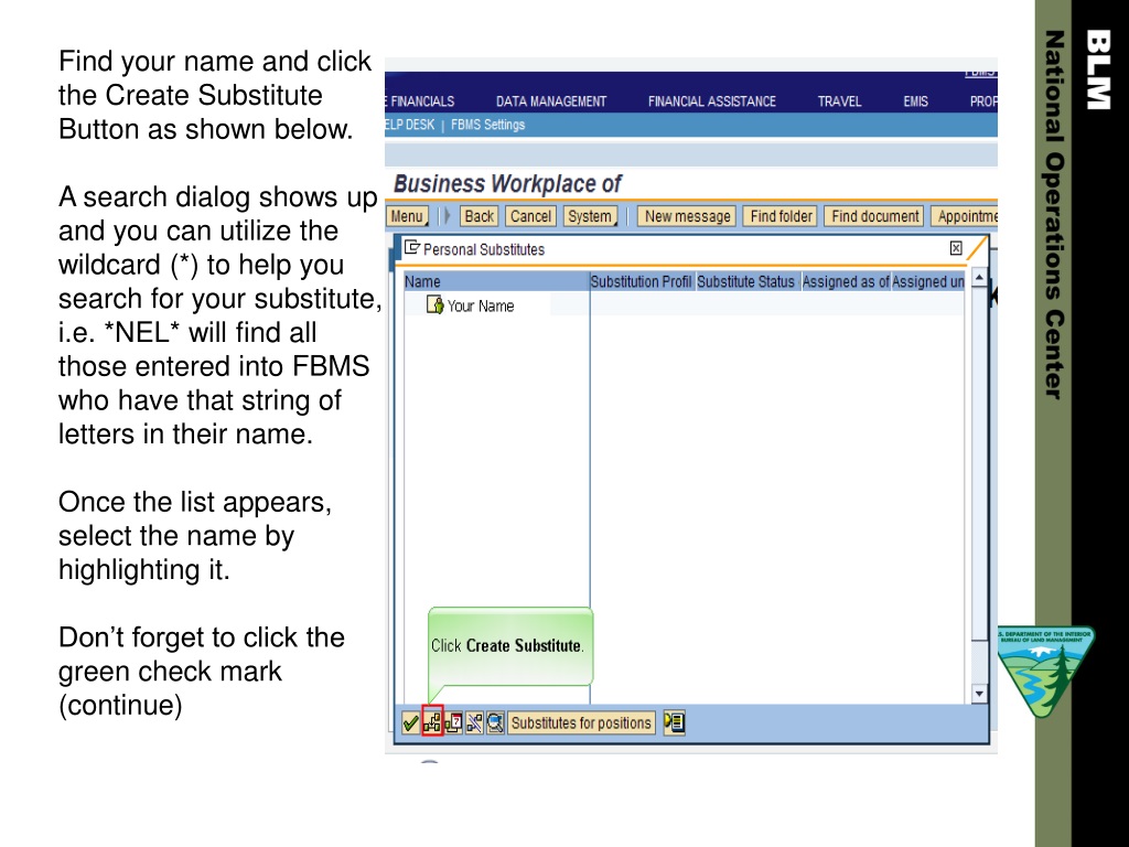 Find your name and click the Create Substitute Button as shown below. A search dialog shows up and you can utilize the wildcard (*) to help you search for your substitute, i.e. *NEL* will find all those entered into FBMS who have that string of letters in their name. Once the list appears, select the name by highlighting it. Don’t forget to click the green check mark (continue)