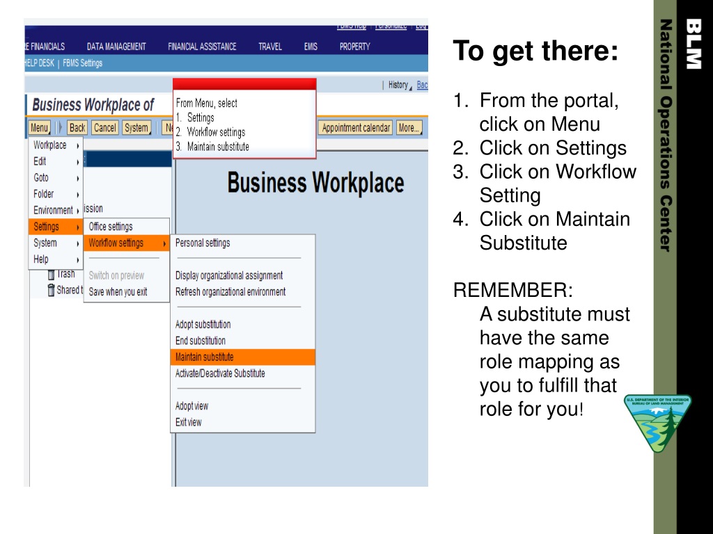 To get there: • From the portal, click on Menu • Click on Settings • Click on Workflow Setting • Click on Maintain Substitute • REMEMBER: • A substitute must have the same role mapping as you to fulfill that role for you!