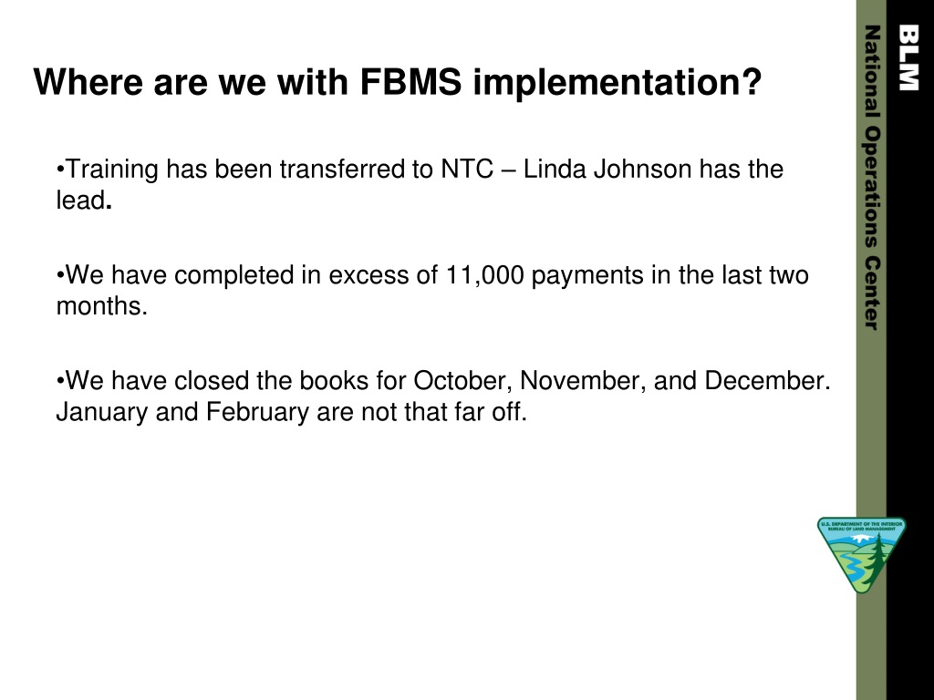 Where are we with FBMS implementation? • Training has been transferred to NTC – Linda Johnson has the lead. • We have completed in excess of 11,000 payments in the last two months. • We have closed the books for October, November, and December. January and February are not that far off.