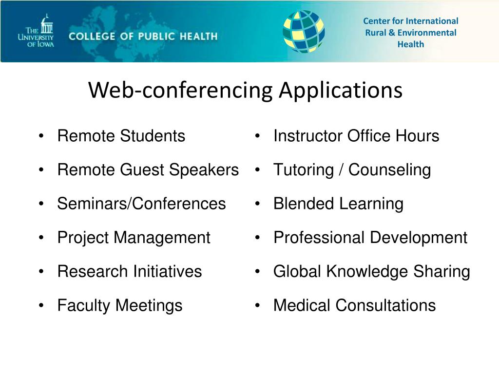 Center for International Rural & Environmental Health Web-conferencing Applications • Remote Students • Remote Guest Speakers • Seminars/Conferences • Project Management • Research Initiatives • Faculty Meetings • Instructor Office Hours • Tutoring / Counseling • Blended Learning • Professional Development • Global Knowledge Sharing • Medical Consultations