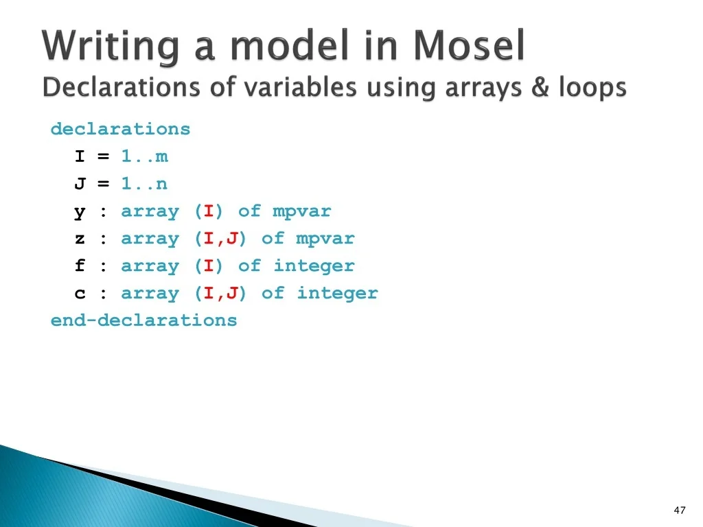 Writing a model in Mosel Declarations of variables using arrays & loops declarations I = 1..m J = 1..n y :array (I) ofmpvar z : array (I,J) of mpvar f :array (I) ofinteger c : array (I,J) of integer end-declarations