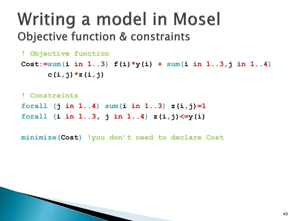 Writing a model in Mosel Objective function & constraints ! Objective function Cost:=sum(i in 1..3) f(i)*y(i) +sum(i in 1..3,j in 1..4) c(i,j)*z(i,j) ! Constraints forall (j in 1..4)sum(i in 1..3) z(i,j)=1 forall (i in 1..3, j in 1..4) z(i,j)<=y(i) minimize(Cost) !you don’t need to declare Cost