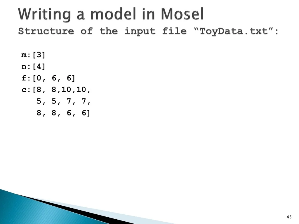 Writing a model in Mosel Structure of the input file “ToyData.txt”: m:[3] n:[4] f:[0, 6, 6] c:[8, 8,10,10, 5, 5, 7, 7, 8, 8, 6, 6]