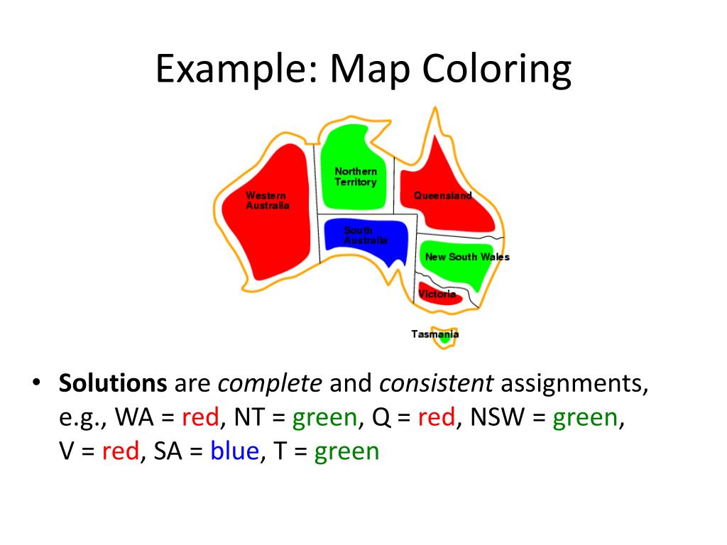 Example: Map Coloring • Solutions are complete and consistent assignments, e.g., WA = red, NT = green, Q = red, NSW = green, V = red, SA = blue, T = green
