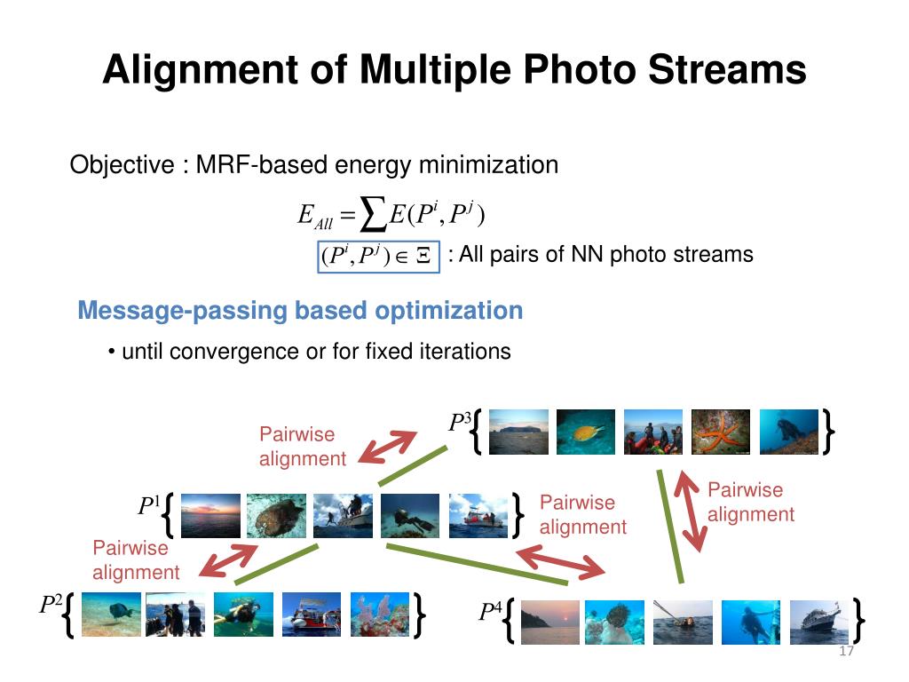 Alignment of Multiple Photo Streams Objective : MRF-based energy minimization : All pairs of NN photo streams Message-passing based optimization • until convergence or for fixed iterations P1 P2 P3 P4