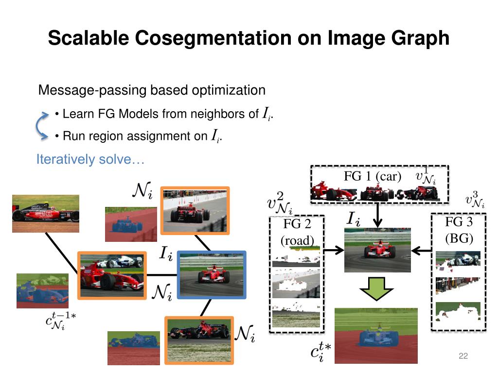 Scalable Cosegmentation on Image Graph Initialization Message-passing based optimization • Supervised: start from seed labels • Learn FG Models from neighbors of Ii. • Unsupervised: use the algorithm of CoSand[Kim et al. 2011]. • Run region assignment on Ii. Iteratively solve… FG 1 (car) FG 3(BG) FG 2(road)