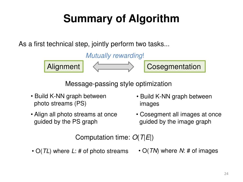 Summary of Algorithm As a first technical step, jointly perform two tasks... Mutually rewarding! Alignment Cosegmentation Message-passing style optimization • Build K-NN graph between photo streams (PS) • Build K-NN graph between images • Align all photo streams at once guided by the PS graph • Cosegment all images at once guided by the image graph Computation time: O(T|E|) • O(TN) where N: # of images • O(TL) where L: # of photo streams